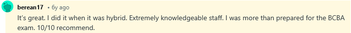 *Online programs vary—the online MA program gives you the coursework and degree needed to sit for the exam; however, the fieldwork needs to be done separately. Note: the online MA is not ABAI-accredited, which could cause some issues when trying to sit. Do some research to make sure this is a good choice for you!