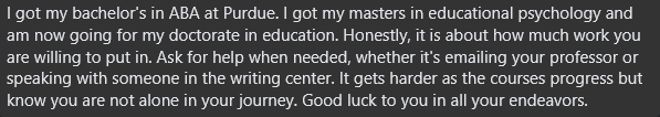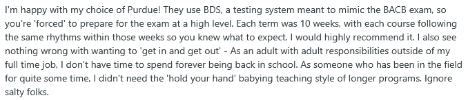 Some Purdue Global graduates recommended the CBA (BDS) modules for preparing to take the BCBA exam. They also discussed the length of the program, saying that it was good for an adult with a full-time job and other responsibilities.