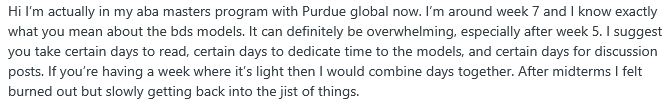 One current Purdue Global student reported that the CBA (BDS) modules were a little overwhelming, but that the best strategy is planning out the week.