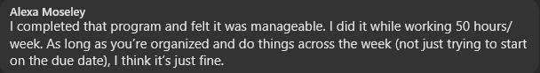 A graduate from the program said that as long as you plan out your week, it is manageable. They also mentioned working 50 hours per week while in the program and being able to handle the load.